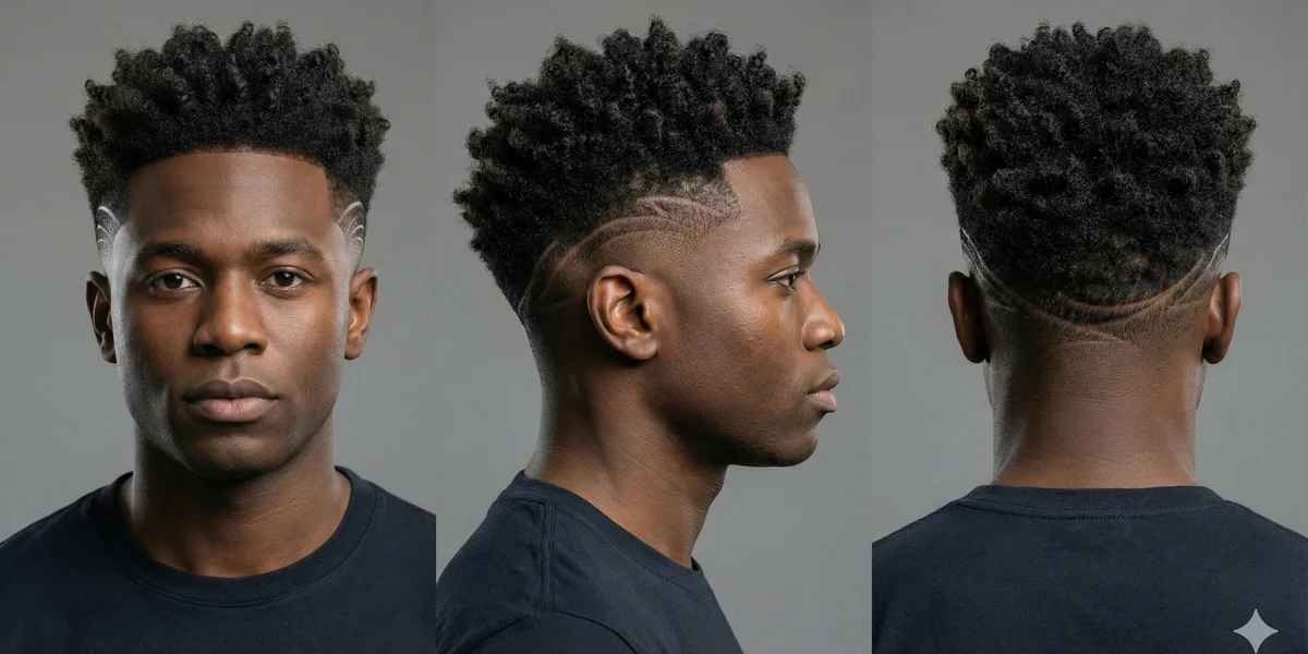Originating from Southern U.S. barbershops in the early 2000s, the Burst Fade features a dramatic semicircular fade radiating outward from behind the ear like a sunburst. This medium-difficulty cut requires skilled blending and works best for men with curly or textured hair and round or oval faces. Style with light pomade to enhance natural texture; maintenance every 2-3 weeks recommended.