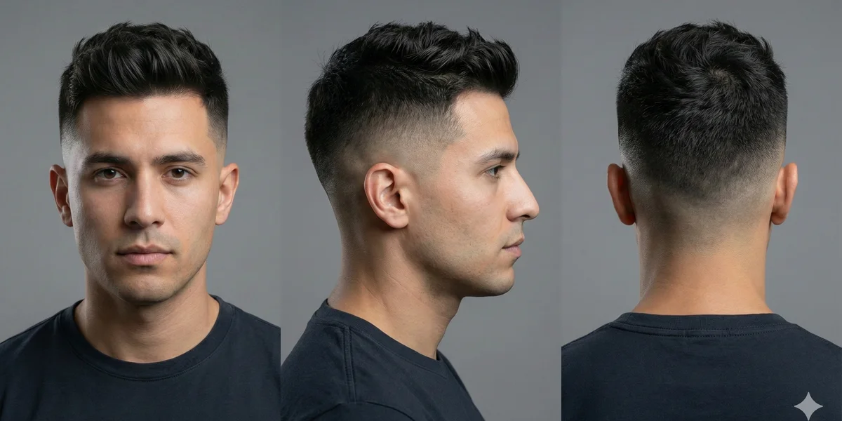 A refined skin fade that curves downward behind the ear, following the natural hairline for an elegant arc. This modern classic delivers maximum contrast between the skin-level sides and longer top, creating a clean yet contemporary silhouette. Suits most face shapes, particularly flattering for round and square faces. Requires touch-ups every 1-2 weeks to maintain the crisp skin line; style with pomade or matte clay.