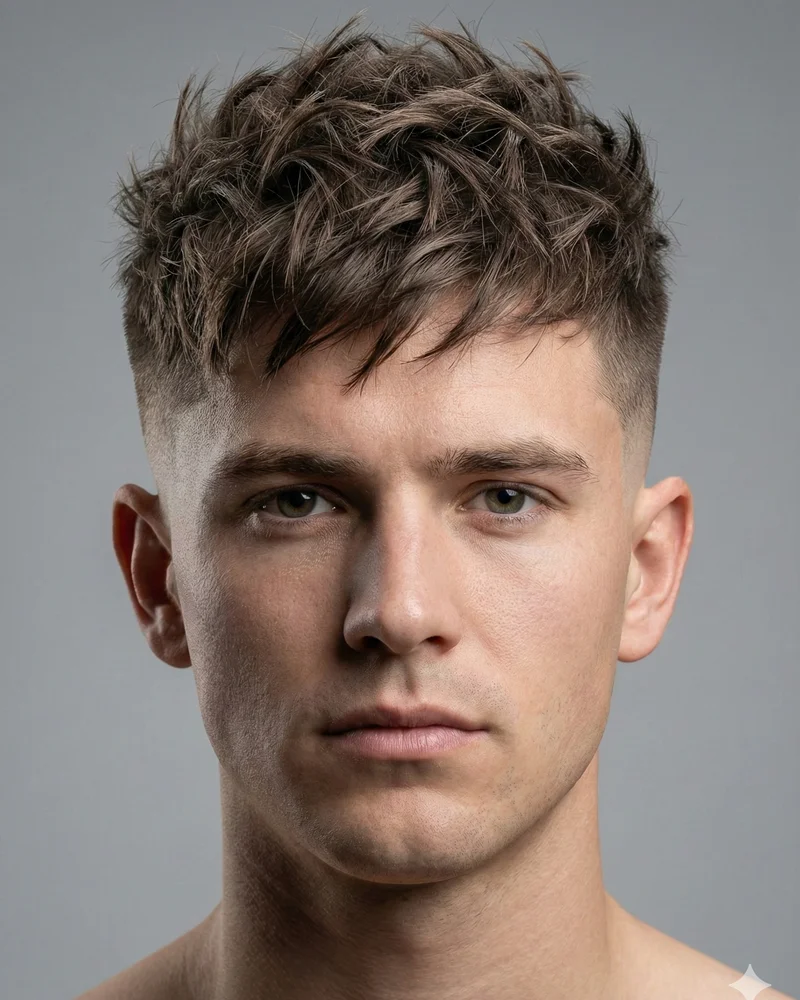 A contemporary style pairing a medium-height skin fade with heavily textured, choppy styling on top that showcases individual hair strands with natural movement. Perfect for men with thick or wavy hair who want a modern, effortless look. The contrast between clean sides and textured top creates visual depth. Style with matte clay or sea salt spray; maintain every 2-3 weeks.
